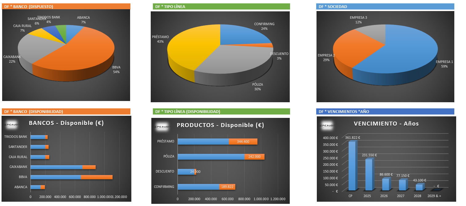 La hoja POOL incorpora una serie de gráficos para el control del nivel de deuda financiera que soporta la Empresa. Desgrana el saldo dispuesto por: