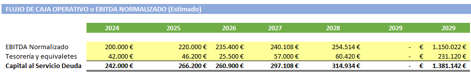 Para usar esta hoja debemos completar los campos sobre Flujos de Efectivo o EBITDA estimado para los próximos años; este montante junto con la tesorería estimada a cada balance final de año sumará el Capital al Servicio de la Deuda que es la base para el cálculo del ratio de deuda principal.